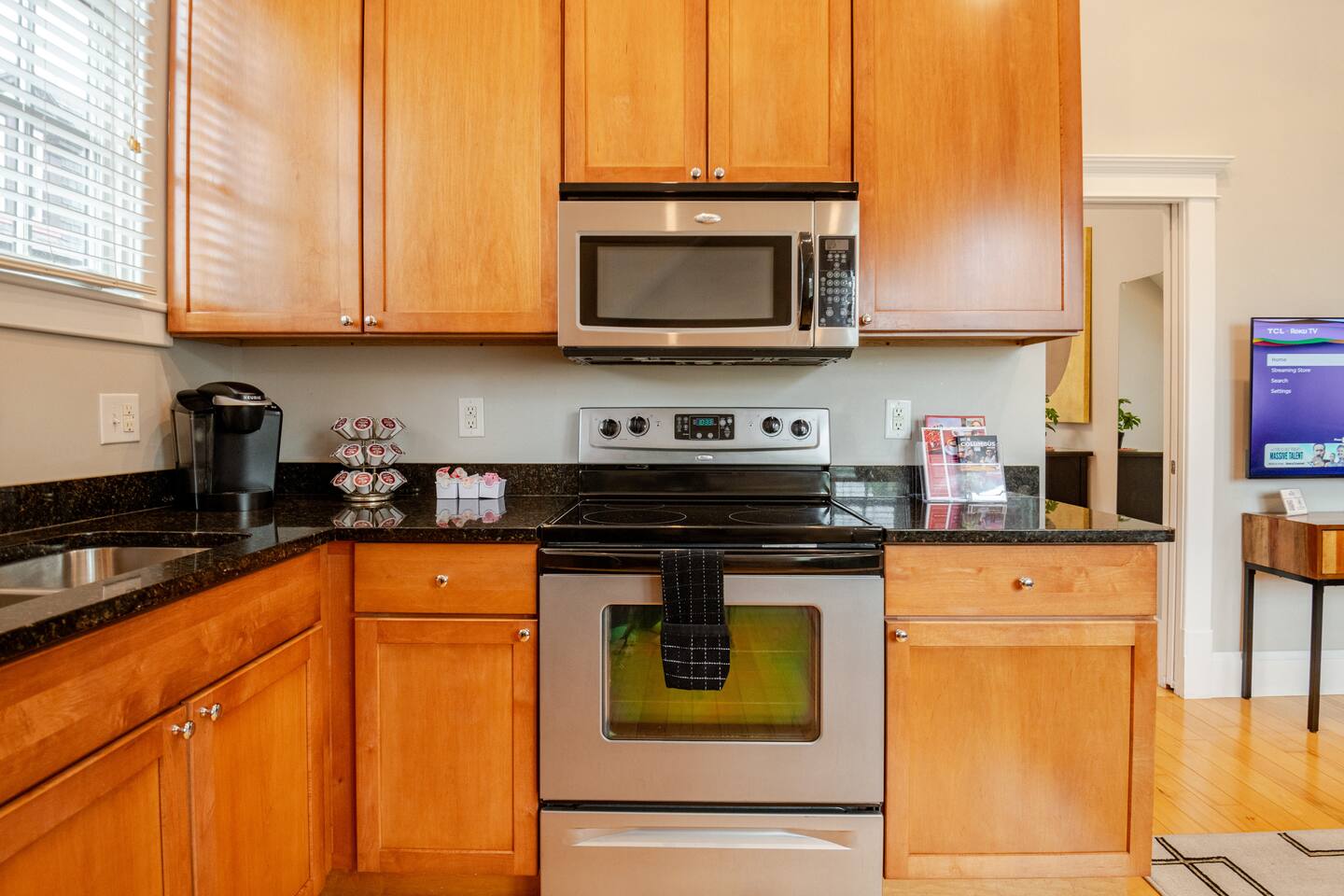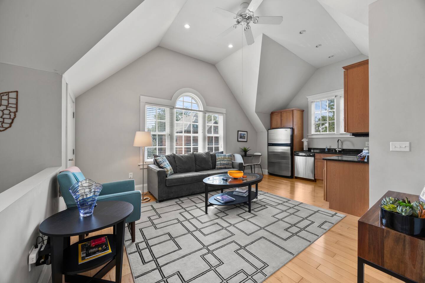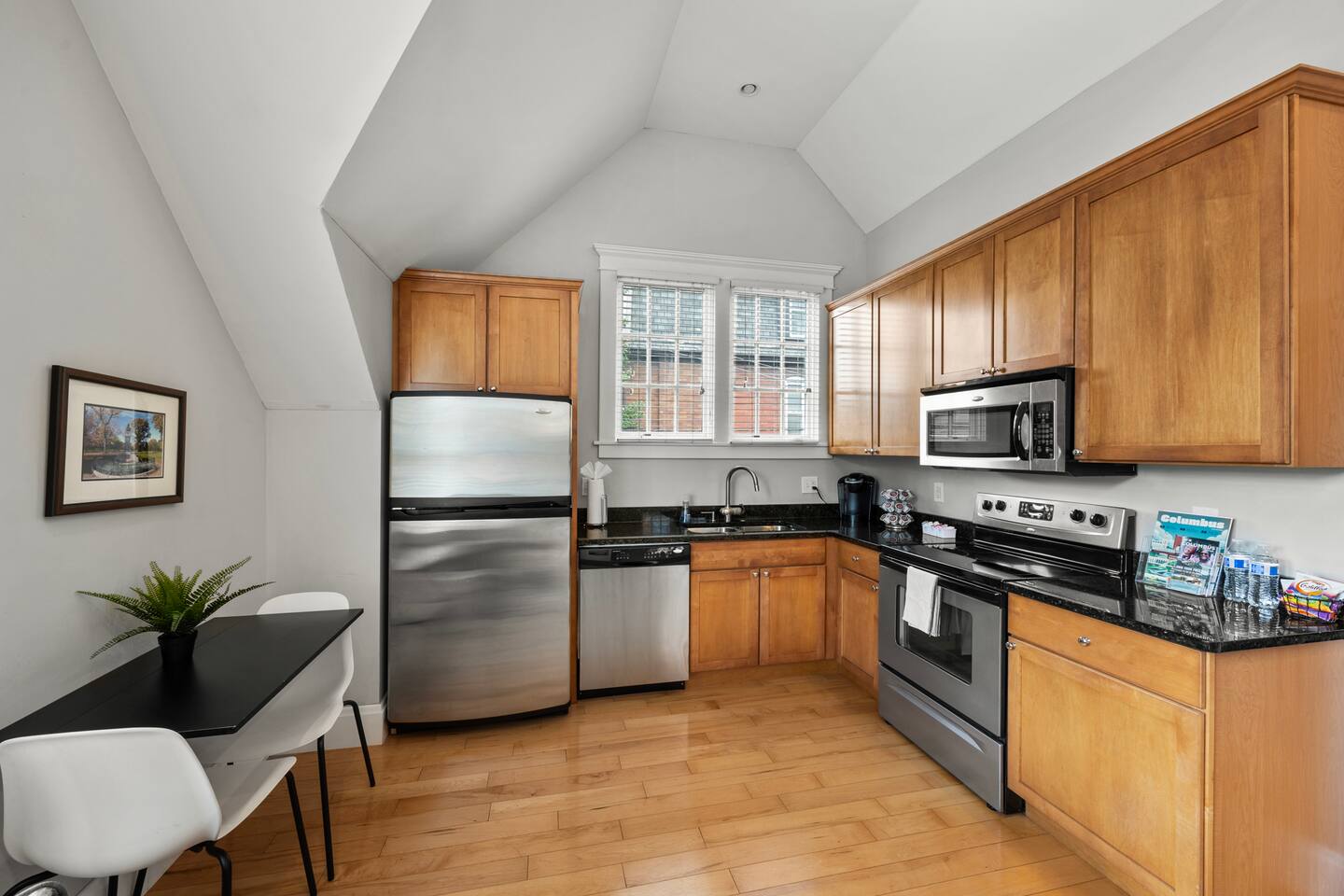 The carriage house is a 2nd floor, one bedroom walk-up with a queen size bed and sleeper sofa (see floor plan in the pictures). The fully-equipped kitchen has stainless steel appliances including a dishwasher, granite counter tops, ice maker, pots/pans, dishes, and utensils as well as a Keurig coffee maker and washer/dryer. There is a 50" television with Roku and several complimentary streaming services. An wireless charger, USB outlets, bottled water, and snacks are also provided. The fully air conditioned apartment has a lot windows for natural light and ventilation on nice days. There are also ceiling fans in the living room and bedroom. The carriage house is 2 blocks from High Street and the Short North Arts District as well as a less than 10 minute walk to the Greater Columbus Convention Center and the North Market. The Arena District, Nationwide Arena, and Express Live are an easy 15 minute walk. The Ohio State University and Downtown Columbus can be reached by car in 5 minutes or by walking or using public transportation, and the airport in 10 minutes. Add my listing to your Wish List by clicking the ❤ in the upper-right corner.