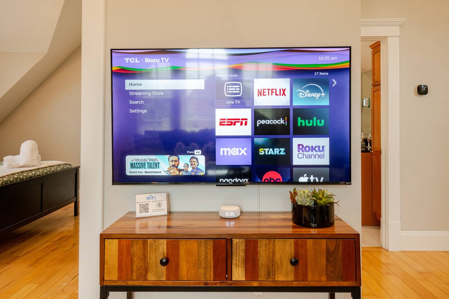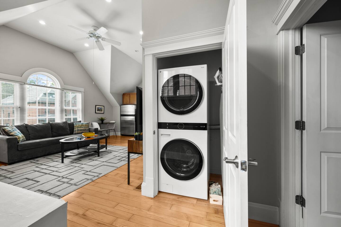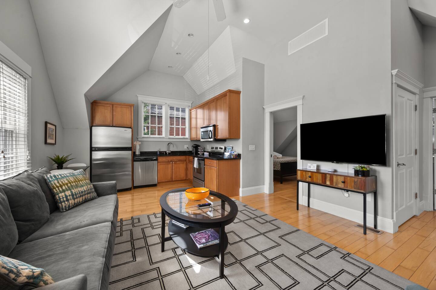 The carriage house is a 2nd floor, one bedroom walk-up with a queen size bed and sleeper sofa (see floor plan in the pictures). The fully-equipped kitchen has stainless steel appliances including a dishwasher, granite counter tops, ice maker, pots/pans, dishes, and utensils as well as a Keurig coffee maker and washer/dryer. There is a 50" television with Roku and several complimentary streaming services. An wireless charger, USB outlets, bottled water, and snacks are also provided. The fully air conditioned apartment has a lot windows for natural light and ventilation on nice days. There are also ceiling fans in the living room and bedroom. The carriage house is 2 blocks from High Street and the Short North Arts District as well as a less than 10 minute walk to the Greater Columbus Convention Center and the North Market. The Arena District, Nationwide Arena, and Express Live are an easy 15 minute walk. The Ohio State University and Downtown Columbus can be reached by car in 5 minutes or by walking or using public transportation, and the airport in 10 minutes. Add my listing to your Wish List by clicking the ❤ in the upper-right corner.